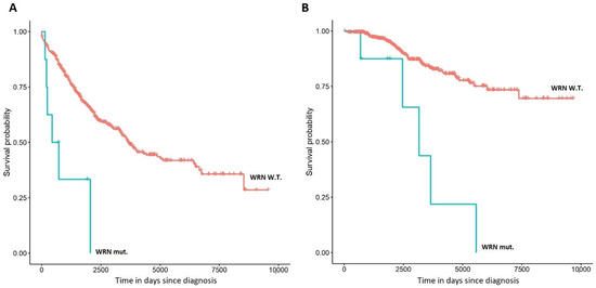 Kaplan–Meier plots representing the association of rare variants in WRN with time to first treatment (A) and overall survival (B) in chronic lymphocytic leukemia (CLL). Variants considered in this plot are represented in Table 4.