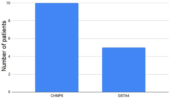 Germline variants with high functional impact were selected for association with risk of B-cell neoplasms using the burden test against public whole-genome sequencing controls. Briefly, this analysis tests if the cumulative frequency of variants affecting each gene in a cohort is significantly different from that of a control cohort. We first analyzed all PTVs detected by VEP, and afterwards we added all variants with high impact consequences according to SNPeff. We selected these variants because they are the most potentially pathogenic. As a result, two genes were significantly enriched in high-impact variants among patients affected by B-cell lymphoid neoplasms (q-value < 0.1) (Figure 3, Table S11). Overall, we identified 2 different variants affecting 15 different cases (Table S12, Figure 3): rs746495175 in CHMP6 (a splice acceptor variant) and rs557844606 in GSTA4 (an inframe deletion within a structural interaction domain). Importantly, inflation statistics were low (ƛ = 0.93 and 0.83 for the VEP-only and VEP + SNPeff models). Additionally, there was an enrichment of CHMP6 variants in lymphoma vs. CLL patients (Fisher’s p-value 0.02, q-value 0.04).