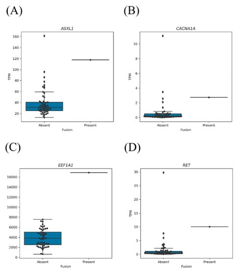 The presence of fusion genes may result in altered expression of one or both of the fusion gene partners [21]. Samples harboring fusions containing TSGs (ASXL1) or oncogenes (CACNA1A, EEF1A1, and RET) exhibited increased expression of those genes relative to the samples without fusions. Gao et al. demonstrated that fusion genes influence oncogene expression, usually via overexpression of oncogenes and reduced expression of TSGs [7]. Further investigation is needed to determine whether the dysregulated oncogene expression is caused by the fusion events or another factor, as in the study by Lu et al. [22].