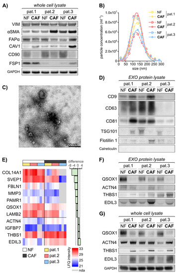 Primary fibroblast-derived EXOs display an activation status dependent protein cargo. The established fibroblast cell lines were subjected to cellular protein isolation after 48 h incubation of equal cell numbers in normal growth medium. EXOs were isolated using combined differential centrifugation and ultrafiltration approach following 48 h of fibroblast incubation in starvation medium. Exosomal protein was isolated in biological triplicates and subjected to Mass Spectrometry. Statistical Analysis was performed in Perseus. (A) Immunoblot analysis of vimentin (VIM), α-smooth-muscle actin (αSMA), fibroblast activation protein α (FAPα), caveolin 1 (CAV1), cluster of differentiation 90 (CD90)/Thy1 and fibroblast-specific protein 1 (FSP1) in primary fibroblasts, including GAPDH as loading control. (B) Particle size distribution in the isolated EXOs (mean of n = 4–10) as measured by nanoparticle tracking analysis (NTA) using ZetaView®. (C) Representative transmission electron microscopy (TEM) image of fibroblast-derived EXOs. (D) Immunoblot analysis of EXO markers CD9, CD63, CD81, Flotillin 1 and Tumor susceptibility 101 (TSG101), including calreticulin as negative control. (E) Heat map of mass spectrometry data illustrating significantly deregulated vesicular proteins. Proteins with more than 4 undefined values in total or more than 3 undefined values in the NF/CAF subgroups are excluded. Paired t test: q < 0.05, diff. > |1.0|. LFQ: label-free quantification; nda: no data acquired. (F) Immunoblot analysis of quiescin sulfhydryl oxidase 1 (QSOX1), actinin α4 (ACTN4), thrombospondin 1 (THBS1) and EGF-like repeats and discoidin domains 3 (EDIL3) in EXOs. (G) Immunoblot analysis of QSOX1, ACTN4, THBS1 and EDIL3 in primary fibroblasts whole cell lysate, including GAPDH as loading control. The images of uncropped western blot figures are shown in Figure S8.
