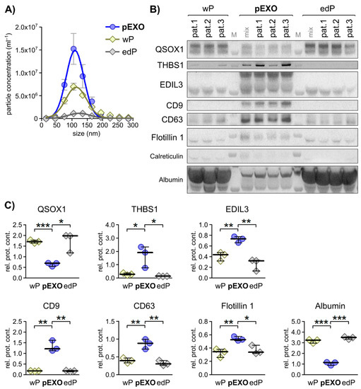 As we aimed to identify potential biomarkers for diagnostic purposes in vitro and to assess these markers in vivo, we investigated the QSOX1, THBS1 and EDIL3 levels in blood plasma obtained from patients 1–3 prior to tumour resection. To explore the expression of the investigated markers, we analysed the plasma (whole plasma, wP), plasma-derived EXOs (pEXO) and the supernatant remaining after isolating the EXOs from the plasma, referred to as EXO-depleted plasma (edP).