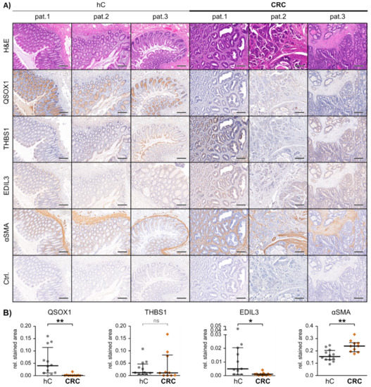 In vivo marker expression in patient-matched healthy and malignant colon tissue. (A) Representative images of paraffin embedded tissue slides of healthy (hC) and malignant (CRC) colon tissue derived from patients 1–3, hematoxylin and eosin (H&E) or immunohistochemically stained for the proteins quiescin sulfhydryl oxidase 1 (QSOX1), thrombospondin 1 (THBS1), EGF-like repeats and discoidin domains 3 (EDIL3), α-smooth-muscle actin (αSMA) and IgG control (Ctrl.). Scale bars equal 250 µm. (B) Graphical IHC staining analysis performed in QuPath. From each patient and tissue, a minimum of three representative areas were subjected to graphical and statistical analysis. Mann-Whitney-U test: * p < 0.05, ** p < 0.01. ns = not significant.
