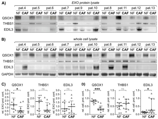 Following validation of three markers of interest on exosomal as well as cellular protein levels in patients 1–3 by immunoblotting, their abundance was investigated in 10 additional NF/CAF pairs. Overall statistical evaluation returned a significant reduction of QSOX1 in CAFs compared to NFs on exosomal and cellular protein expression level, and significantly induced expression of EDIL3 in whole cell lysate. In agreement of these results, Herrera et al. identified induced expression of EDIL3 in CAFs with a low promigratory potential compared to NFs, while QSOX1 was reduced on the cellular level [85]. Interestingly, in CAFs with a high promigratory potential, the proteins were inversely regulated, indicating that a differential regulation of these markers in fibroblasts is related to differential tumour progression profiles. THBS1 did not show a differential regulation in CAFs compared to NFs in our analyses, neither in whole cells nor in derived EXO-associated protein. EDIL3 did not reach significance in the exosomal protein immunoblot analysis, which could be associated to its function as an immune system modulator.