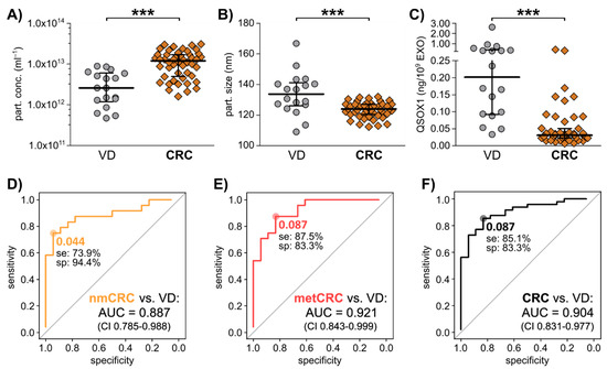 Diagnostic ROC curve analysis comparing non-metastatic CRC (nmCRC) patients, metastatic CRC (metCRC) patients or all CRC patient with VD returned AUC values of 0.887 (confidence interval 0.785–0.988), 0.921 (confidence interval 0.842–0.999) and 0.904 (confidence interval 0.831–0.977), respectively (Figure 5D–F). Further, an optimal cut-off of 0.087 ng QSOX1/109 pEXOs could differentiate metCRC and overall CRC patients from VD with a sensitivity of 87.5% and 85.1% (Figure 5E,F).