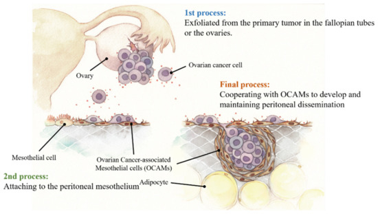 Three processes of development of peritoneal dissemination from ovarian cancer (OvCa). First, OvCa cells are exfoliated from the primary tumor in the fallopian tubes or the ovaries. Second, the free OvCa cells encounter the peritoneal mesothelium and attach to it. Finally, OvCa cells cooperate with OvCa-associated mesothelial cells (OCAMs) to develop and maintain peritoneal dissemination.