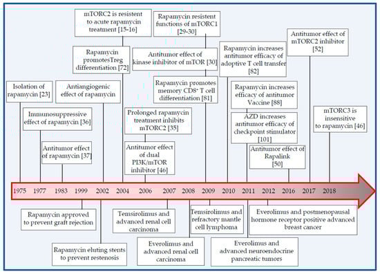 Milestones in development and therapeutic applications of mTOR inhibitors in the field of malignant cancers and immunity. Major therapeutic applications are described below the timeline. Corresponding studies are provided in square parentheses. Adapted from References [42,73].