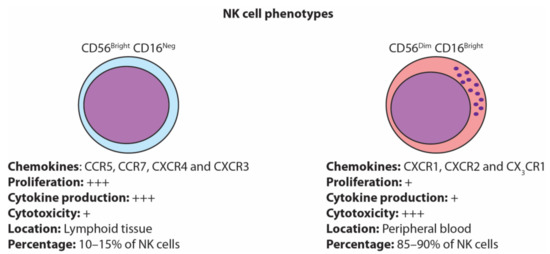 NK cells are generally characterized into two major subsets based on their expression of CD56 (adhesion molecule) and CD16 (Fc gamma receptor). NK cells are often classified as CD56brightCD16neg or CD56dimCD16bright, which represent functionally distinct NK cell phenotypes [11] (Figure 1). CD56brightCD16neg NK cells represent 10–15% of the total NK cell population and are mainly present in lymph nodes (~75%). They are potent producers of cytokines, especially IFN-γ, and have poor cytolytic capacity [11]. In contrast, CD56dimCD16bright NK cells represent 90% of peripheral blood NK cells and possess strong cytolytic capacity but are relatively poor producers of cytokines [12].