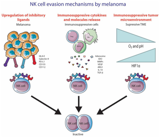 Many cancers upregulate the ligands for NK cell-activating receptors during malignant transformation. However, many cancers, including melanoma, develop various ways to evade NK cell recognition and lysis. NK cell evasion can be mediated through cell-to-cell contact with melanoma cells, secretion of cytokines/molecules by tumor cells or by immunosuppressive cells and the creation of a hypoxic tumor microenvironment (Figure 3).