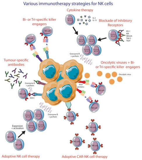 Various immunotherapy strategies to improve NK cell functionality. This figure was created using Servier Medical Art templates, which are licensed under a Creative Commons Attribution 3.0 Unported License; https://smart.servier.com (accessed 10 October 2020).
