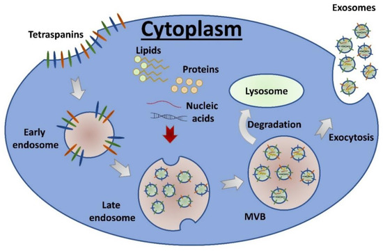 Exosomes are membrane-enclosed nanovesicles (30–150 nm) of endosomal origin. Exosomes arise as a result of the concavity of the plasma membrane inward, resulting in the formation of an early endosome. The early endosome matures into the late endosome, which then transforms into a multivesicular body (MVB) that could attach to the plasma membrane from inside and release exosomes into the extracellular space [64,65] (Figure 1). Exosomes can be detected in various biological fluids such as urine, cerebrospinal fluid, saliva, blood, and its derivatives (serum and plasma). Exosomes are secreted by all types of cells, either non-tumorigenic and cancerous. These vesicles are enclosed by a double film of symmetrically distributed lipids containing several tetraspanins and other membrane proteins involved in the formation of MVB (CD9, CD63, CD81, TSG101, and Alix). However, the full set of proteins present in the exosome cargo (involving thousands of different cellular proteins) is variable and reflects the current phenotype of the parent cell. Except for proteins and lipids, exosomes also contain different classes of nucleic acids (single-stranded RNA, long non-coding RNA, and microRNA) and metabolites, whose composition is also regulated by the state of the cell [64,66,67].