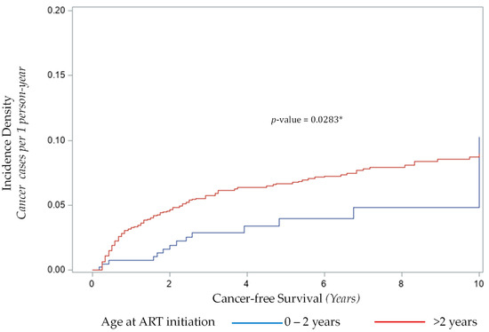 Incidence density function of cancer in children with HIV in BIPAI cohort by age at start of ART. *: p < 0.05.