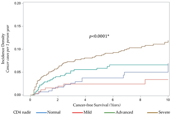 Incidence density function of cancer in children with HIV infection by CD4 Nadir during HIV care. *: p < 0.05.