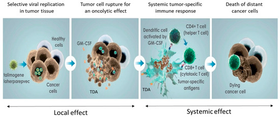 Figure 1. T-VEC proposed mechanism of action. TDA tumor-derived antigen. GM-CSF: Granulocyte–macrophage colony-stimulating factor. [33]. Image courtesy of Amgen Inc. Open access: used under the terms of the Creative Commons Attribution 4.0 International License (http://creativecommons.org/licenses/by/4.0/). Accessed on 22 January 2021.