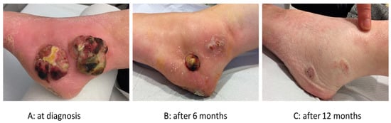 Figure 2. 62 years old patient presenting with 2 huge malleolar lesions and lymphnodal metastases from acral melanoma. She was treated with T-VEC over a period of 2 years, achieving a complete remission, which is lasting after 2 years from the end of treatment. (A). At diagnosis; (B). after 6 months; (C). After 12 months.