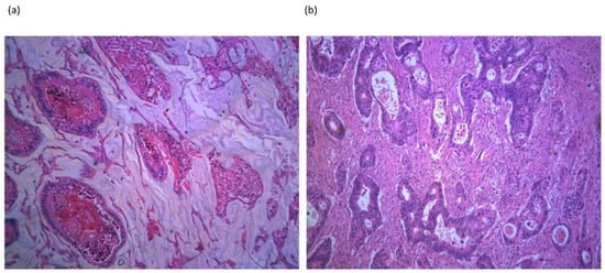 Representative histological slides of: (a) mucinous colorectal adenocarcinoma displaying abundant extracellular mucin in a 61 year old male patient with a pT4N2 mucinous rectal tumor. (b) Non-mucinous colorectal adenocarcinoma in a 67 year old female patient with a pT3N1 rectal tumor. H&E-stained section, 10× magnification, imaged with Leica DM 4000B microscope (Leica Microsystems, Mannheim, Germany).