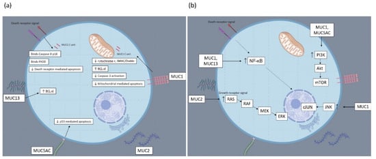 (a) Interaction of mucin glycoproteins with apoptosis proteins in colorectal cancer cells. (b) Cell survival mechanisms altered by expression of mucin glycoproteins in colorectal cancer cells.