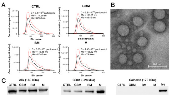 Particles were isolated by differential centrifugation from 138 serum samples of patients with GBM, BM), M and CTRL. Isolated sEVs were characterized by transmission electron microscopy (TEM) and nanoparticle tracking analysis (NTA), as well as by examining characteristic sEV markers (Alix, CD81 and calnexin) by Western blotting (WB) (Figure 1). Average concentration, mean and mode diameter of the particles were measured as 7.41 × 1010 particles/mL, 111.20 nm and 83.32 nm, respectively. Alix, CD81 positivity and calnexin negativity was determined (see Figure S1 for the original WB images).