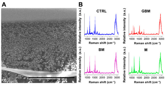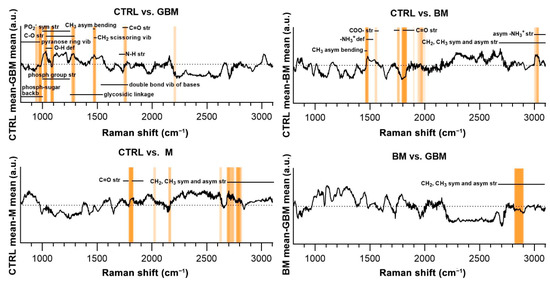 Regarding the CTRL vs. BM comparison, the wavenumbers found to have an important role in distinguishing the BM group from the control mainly correlated with lipids (CH3 asymmetrical bending (1470–1490 cm−1), CH2 and CH3 symmetrical and asymmetrical stretching vibrations (2700–3100 cm−1)) and amino acids (–NH3+ deformation band (1485–1150 cm−1), –NH3+ asymmetrical stretching (3000–3100 cm−1), carboxylate ion stretching (1560–1600 cm−1) and C=O stretching vibrations of the carboxyl group (1700–1755 cm−1)). Regarding the CTRL vs. M and BM vs. GBM comparisons, the wavenumbers highly correlated with vibrations originating from acyl chains of lipids, such as CH3 and CH2 symmetric and asymmetric stretching vibrations (2700–3100 cm−1) (see Table S1 for the tabular form of the discriminative spectral differences).