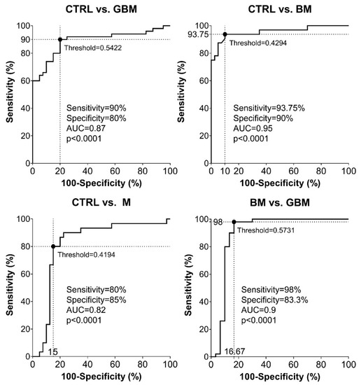 According to the ROC analyses, sensitivity and specificity values were as follows: 90% and 80% for CTRL vs. GBM, 93.75 and 90% for CTRL vs. BM, 80% and 85% for CTRL vs. M, and 98% and 83.3% for BM vs. GBM, respectively. In the same order of comparisons, AUC values were 0.87, 0.95, 0.82 and 0.9 (Figure 5).