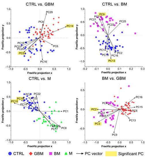 Based on the results of the FreeViz method and p-values from Welch’s t-test, PC14 and PC2, PC9 and PC13, P10 and PC19, and PC2 and PC3 explained most of the discriminative differences in the CTRL vs. GBM, CTRL vs. BM, CTRL vs. M and BM vs. GBM comparisons, respectively (p < 0.05 in all cases) (see Figure S2 for the score plots of the selected PCs).