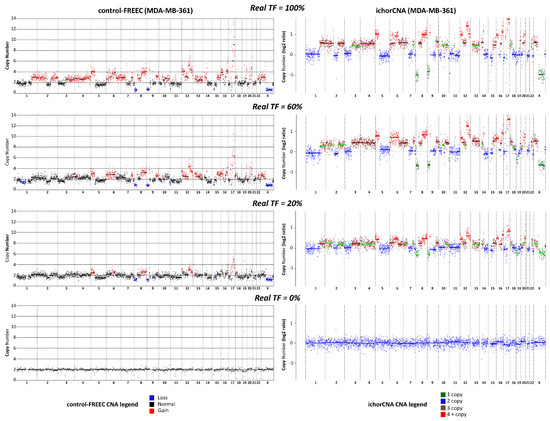 Comparison between ichorCNA and control-FREEC. Copy number alteration (CNA) profiles obtained with low-pass whole genome sequencing (lpWGS) from samples formed by 100% MDA-MB-361 cells (top row), 100% peripheral blood lymphocytes (PBL, bottom row), and artificially-generated mixed samples containing 60% and 20% MDA-MB-361 cells mixed with PBL (second and third row from the top, respectively). CNA profiles reported on the left-hand side were obtained with control-FREEC algorithm; CNA profiles on the right hand side were obtained with ichorCNA. In the case of control-FREEC profiles, different colors refer to loss, gain or their absence (normal) in each genomic region; in the case of ichorCNA, color codes refer to 1 copy, 2 copies, 3 copies, more than 4 copies for each single genomic region. Color codes are reported at the bottom of the figure.