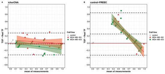 Bland–Altman plot describing the agreement between tumor genome fraction (TGF) measures obtained with ichorCNA (A), control-FREEC (B) and the real tumor fractions (TFs). Differences between triplicate TGF measures and real TFs are separately reported for MDA-MB-361 (red triangles) and MDA-MB-453 (green squares) as a function of the measures’ averages. Linear fit for each cell line is reported with intervals of confidence. Dashed lines from top to bottom represent the mean of difference plus two standard deviations, mean of difference and mean of difference minus two standard deviations.