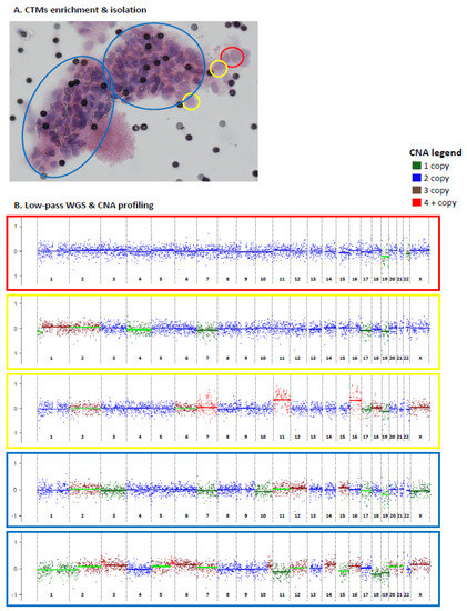 Circulating tumor microemboli (CTMs) isolation and CNA profiling by low-pass whole genome sequencing (lpWGS). Enriched and individually isolated CTMs (either as entire CTMs or divided in parts) (A) were subjected to lpWGS for CNA profiling (B). Distinct parts of the same CTM are highlighted using different colors (yellow = 1 cell; red = 2 cells, blue = part of CTM. CNA profiles are reported in log-ratio scale between −1 and 1.