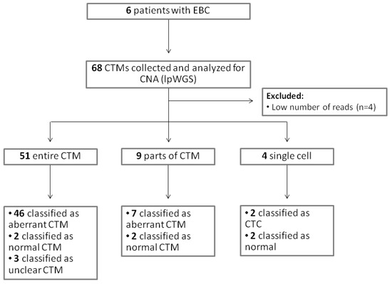 A total of 68 samples (54 entire CTMs, 9 parts of CTMs, and 5 single cells from CTMs) were collected and analyzed for CNA (Table S2). A CONSORT plot for the analyzed samples is reported in Figure 4.