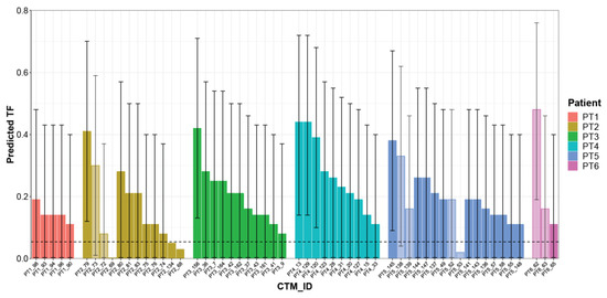 Predicted TF for each CTM. Histogram reporting TF estimated using the mixed logistic regression model for each single CTM. Each color represents a single patient; light-colored bars refer to distinct parts collected from the same CTMs. CTM-IDs are the same as reported in Table S2. Prediction intervals as derived from the linear mixed model (LMM) are reported as error bars.