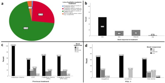 (a) Line of palliative systemic treatment. Best response to treatment for (b) all patients; (c) based on previous treatment; (d) based on PD-L1 status.