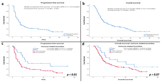 Kaplan–Meier curves for (a) progression-free survival and (b) overall survival. Kaplan–Meier curves for (c) progression-free survival and (d) overall survival in patients with or without immune-related toxicities (IRTs).