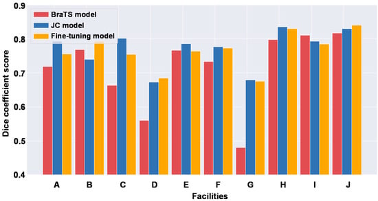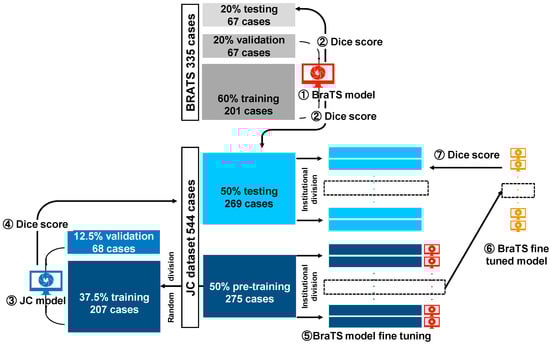 - Fine-tuning model: The BraTS model was fine-tuned to perform an optimized analysis in each facility. A maximum of 20 cases (randomly selected) from the pre-training portion of the JC dataset were used for fine-tuning. Here, if a facility had fewer than 20 training cases, all the training portions in the JC dataset from the facility were used for fine-tuning.