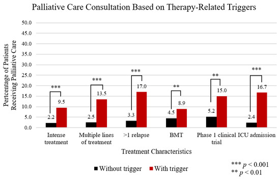 In regard to therapy-related triggers, 46.5% received intense treatment, 27.8% of patients had multiple lines of therapy, 16.4% experienced more than one relapse, 25.3% had at least one bone marrow transplant, 4.3% participated in a phase 1 clinical trial and 22.4% of patients were admitted to the ICU. All were associated with higher rates of PC consultation (Figure 1).