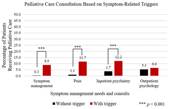 Demonstrates a comparison of all patients with a PC consultation in relation to the presence (red bar) or absence (black bar) of treatment-related PC triggers.