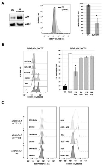 Fibroblasts reverse the characteristic ferroptosis phenotype of pancreatic ductal adenocarcinoma (PDAC) xCTKO cells. (A). The expression level of xCT in human dermal fibroblasts (HDF) under basal and amino acid (AA) starvation conditions (Western blot, left panel—ARD1 used as loading control), their sensitivity to xCT inhibition by erastin (ERA) seen through the lipid hydroperoxide accumulation after 24 h (BODIPY 591/581 C11 staining, middle panel), i.e., cell viability after 48 h (right bar graph). (B). Optimization of the co-culture conditions: accumulation of the lipid hydroperoxides (left) and cell viability (right) of MiaPaCa-2 xCTKO cells co-cultured with 3%, 6%, 12% or 25%, of HDF cells during 24 h and 48 h, respectively. (C). BODIPY 591/581 C11 staining of MiaPaCa-2 wild type (wt) and xCTKO cells cultured for 24 h in full or fractionated (lower (<) or higher (>) then 3 kDa, left and right panel, respectively) conditional media (CM) of HDF; dCM = dialyzed conditional media (>3 kDa). All experiments have been performed in triplicate and the representative blots and histograms are shown. Bar graphs show mean ± SEM; n = 3; *, p < 0.05, comparison with control group.