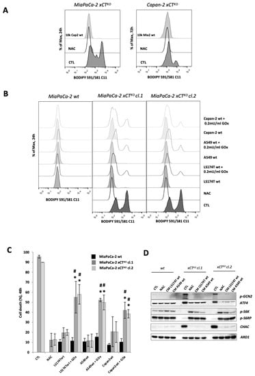 xCT-expressing cells export a redox-sensitive agent which prevents ferroptosis and restores amino acid imbalance in xCTKO cells. (A). Lipid hydroperoxide accumulation in xCTKO PDAC cells co-cultured with other PDAC wt cells or in media supplemented with an alternative cysteine-donor—N-acetylcysteine (NAC). (B,C). Phenotype of MiaPaCa-2 xCTKO cells co-cultured with different xCT-expressing cells (LS174T, A549 and Capan wt) in media +/− the low dose of pro-oxidant, glucose oxidase (0.2 mU/mL GOx): B. BODIPY 591/581 C11 staining; (C). Cell death. (D). MiaPaCa-2 wt and xCTKO cells were cultivated for 24 h in DMEM +/− 1 mM NAC, or in conditioned media (CM) of LS174T/A549 wt. Changes in phosphorylation status and protein abundance of members of the two major AA-sensing pathways GCN2 (p-GCN2/ATF4) and mTORC1 (p-S6K1 and p-RPS6) were analyzed by Western blot. All experiments have been performed in triplicate and the representative blots and histograms are shown. Bar graph shows mean ± SEM; n = 3; *, p < 0.05, comparison with WT control group; #, p < 0.05, comparison with the corresponding untreated group.