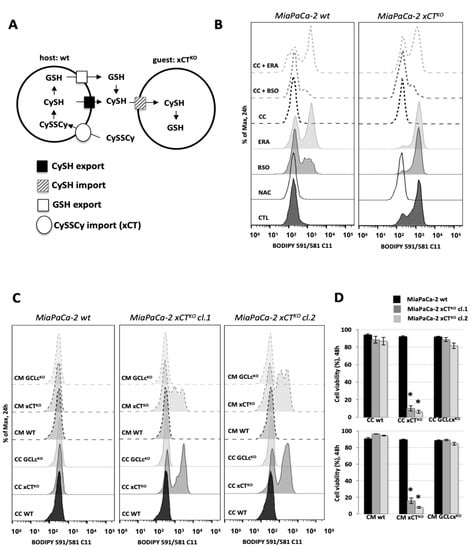 Cystine-cysteine shuttles fuel cooperation between WT and xCTKO cells. (A). Schematic representation of the cystine-cysteine (CySSCy, CySH) shuttle: xCT-expressing cells (“host”) are able to import the oxidized form of cysteine, reduce it and export it. Or, in the alternative scenario, the “host” cells can synthesize and export glutathione (GSH), which then will be cleaved outside the cell to the constituent amino acids. Cysteine provided in one or both ways is taken up by the xCTKO cells (“guests”) maintaining the amino acid and redox balance. (B). MiaPaCa-2 wt or xCTKO cells alone (full outer lines of the histograms) or in the co-culture with A549 wt (CC—dashed outer lines of the histograms) counterparts in DMEM media +/− 1 mM N-acetylcysteine (NAC), 100 μM inhibitor of GSH biosynthesis (buthionine sulphoximine, BSO) or 1 μM inhibitor of xCT, erastin. (C). Accumulation of lipid hydroperoxides and (D). Cell viability of MiaPaCa-2 xCTKO cells in co-culture (CC) or cultivated in the presence of conditional media (CM) of Capan-2 GCLcKO or xCTKO cells during (C) 24 h and (D) 48 h. All experiments have been performed in triplicate and the representative histograms are shown. Bar graph shows mean ± SEM; n = 3; *, p < 0.05, comparison with WT control group.