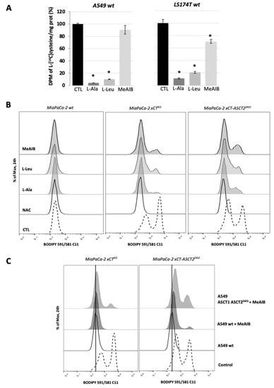 Multiple cysteine transporters are necessary for “guest–host” intercommunication. (A). Cysteine transport activity of A549 wt and LS174T wt cells was measured by the uptake of [14C]- 1, 2, 1′, 2′-cystine (14C-cystine) reduced by 100 μM β-mercaptoethanol in HBSS media containing 50 μM cold cystine and supplemented or not with 10 mM L-alanine, L-leucine or MeAIB. These results represent the average ± SEM, n = 2, comparison with WT control cells, * p < 0.05. (B). Accumulation of the lipid hydroperoxides in MiaPaCa-2 wt, xCTKO or xCT-ASCT2DKO (guest cells) co-cultured with A549 wt cells (host cells) in the presence or not of the 1 mM NAC, 3 mM L-alanine, 3 mM L-leucine or 3 mM MeAIB after 24 h. (C). Lipid hydroperoxides levels measured by BODIPY 591/581 C11 staining and FACS analysis of MiaPaCa-2 xCTKO and MiaPaCa-2 xCT-ASCT2DKO (guest cells) co-cultured for 24 h with A549 wt or A549 ASCT1-ASCT2DKO (host cells) in the presence or not of SNAT inhibitor, MeAIB; Control condition represents the phenotype of guest cells in the absence of host cells. Representative histograms of three independent experiments are shown.