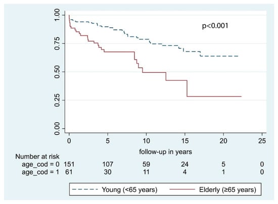 Our results show that age at surgery, both dichotomized at 65 years of age and considered as a continuous variable, and preoperative KPS ≤ 70 were independently correlated with a reduced OS (Table 3). As expected, younger patients had significantly longer OS after STR compared to the older individuals (Figure 2). Specifically, every year carries a 5% increased risk of death. In the present study, only WHO grade I meningiomas were included, and OS was calculated considering all causes of death. Therefore, the effect of different residual life expectancies (RLE) cannot be ruled out. Considering patients >65 years, the median age at surgery was 71.7 [IQR 7.3] years and median OS was 5.0 [IQR 5.9] years, the sum of which was quite similar to the average life expectancy in Norway at 77.3 years in 1990 [20]. Conversely, the median age in the younger cohort (<65 years) was 52.0 years [IQR 14.9] years, and median OS was 7.9 years [IQR 8.7] years. In this case, it is likely that median OS mirrors the length of follow-up instead of RLE. Our conjectures are shared by other authors [21,22,23]. Among them, Hasseleid et al. [3] found that increased median age at diagnosis was independently correlated with a reduction of OS and that this observation was biased by the naturally limited RLE of older individuals. Later, Brokinkel et al. [21] found that the OS in older patients was significantly shorter as compared to the sex- and age-matched population, indicating excess mortality [24]. Altogether, the difference detected in our cohort is likely ascribable to different RLEs. However, the decision of operating on elderly individuals should always be cautiously weighed up because of the increased risk of postoperative hemorrhages, wound, or systemic infections [25,26,27].
