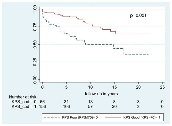 An independent association between KPS > 70 and prolonged OS was identified (Table 3; Figure 3). Indeed, patients with a good preoperative KPS had less than half the risk of death of any cause during the study period compared to those with poorer KPS. We further analyzed the predictive role of KPS with regard to neurological outcome, early postoperative complications, and perioperative mortality. According to multivariable analysis, patients with poor KPS had more than 6 times the risk of developing a postoperative hematoma requiring surgical evacuation. Preoperative KPS is a robust predictor of survival in large meningioma cohorts [4,28,29], as well as in more selected subgroups and is included in several prognostic scores [10,30,31,32]. However, KPS reflects patient’s general condition and provides no information to clinicians with respect to neurological and surgical outcome. The inverse correlation between KPS and postoperative hematomas delineated in the present study is limited by the small number of patients analyzed and should be further investigated in a prospective study.