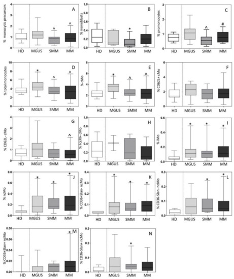 Distribution of monocytic precursors (total monocytic precursors, monoblasts and promonocytes; panels A–C), total monocytes (Mo) (panel D) and their subsets (panels E–N) in bone marrow (BM) of newly-diagnosed MGUS (n = 19), SMM (n = 13) and MM (n = 81) patients vs. age-matched HD (n = 15). In panels A-N, notched boxes extend from the 25th to the 75th percentile values; the lines in the middle and vertical lines correspond to median values and the 5th and 95th percentiles, respectively. Statistical significant differences (p ≤ 0.05) were observed vs. * HD, ^ MGUS, and # SMM patients after applying the Mann–Whitney non-parametric test (as the KS normality test showed that data for these variables did not follow a normal distribution). cMo: classical monocytes; iMo: intermediate monocytes; ncMo: non-classical monocytes; HD: healthy donor; MGUS: monoclonal gammopathy of undetermined significance; SMM: smoldering multiple myeloma; MM: multiple myeloma.