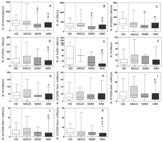 Distribution of total monocytes (Mo) (panel A) and monocyte subsets (panels B–K) in blood of newly-diagnosed MGUS (n = 22), SMM (n = 13) and MM (n = 88) patients vs. age-matched HD (n = 97). In (panels A–K), notched boxes extend from the 25th to the 75th percentile values; the lines in the middle and vertical lines correspond to median values and the 5th and 95th percentiles, respectively. Statistical significant differences (p ≤ 0.05) were observed vs. * HD, ^ MGUS, and # SMM patients after applying the Mann–Whitney non-parametric test (as the KS normality test showed that data for these variables did not follow a normal distribution). cMo: classical monocytes; iMo: intermediate monocytes; ncMo: non-classical monocytes; HD: healthy donor; MGUS: monoclonal gammopathy of undetermined significance; SMM: smoldering multiple myeloma; MM: multiple myeloma.