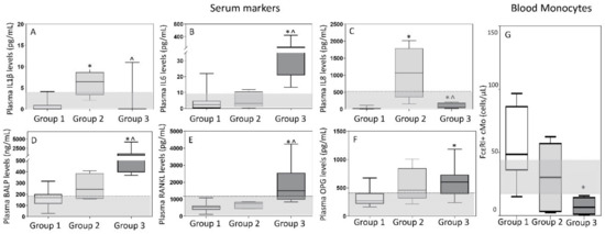 Soluble levels of cytokines (panels A–C) and bone-associated markers (panels D–F) in plasma and absolute FcεRI+ cMo counts in blood (panel G) of MGUS, SMM, MM and HD classified by multivariate analysis into the T-distributed stochastic neighbor embedding (T-SNE)-defined groups 1, 2 and 3. In (panels A–G), notched boxes extend from the 25th to the 75th percentile values; the lines in the middle and vertical lines correspond to median values and the 5th and 95th percentiles, respectively. Normal range is represented by a gray area limited by a horizontal black dotted line. Statistical significant differences (p ≤ 0.05) were observed vs. * group 1 or ^ group 2 after applying the Mann–Whitney non-parametric test (as the KS normality test showed that data for these variables did not follow a normal distribution). IL: interleukin; BALP: bone alkaline phosphatase; RANKL: receptor activator of the nuclear factor-kB ligand; OPG: osteoprotegerin; cMo: classical monocytes.