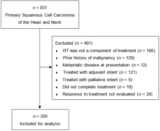 To be included in this study, the primary tumor had to be: (1) an invasive squamous cell carcinoma limited to the head and neck, (2) treated with definitive RT or CRT, and (3) successfully completed treatment. Patients were excluded if they had a previous history of non-cutaneous malignancy or if response to treatment was unable to be evaluated. Our complete patient selection criteria are shown in Figure 1. Overall, 831 primary HNSCC patients were diagnosed or treated between 2007 and 2017. Of these, 350 (42%) patients met the above selection criteria and had complete follow up data.