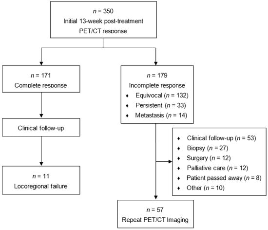 Flowchart of patient responses and clinical outcomes following initial 13 week post-treatment PET/CT scan.
