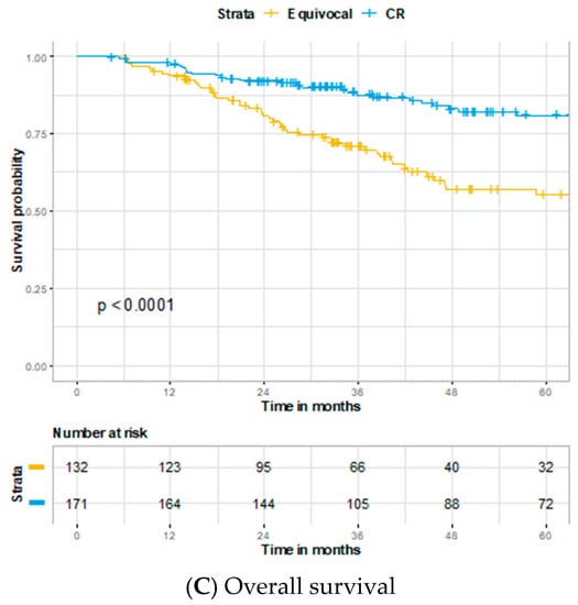 Kaplan–Meier curves comparing patients following initial PET/CT imaging with a complete response versus an equivocal response: (A) Freedom from progression, (B) disease-specific survival, and (C) overall survival