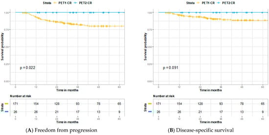 Kaplan–Meier curves comparing patients who achieved a complete response on initial PET/CT imaging versus those who achieved complete response on repeat PET/CT imaging: (A) Freedom from progression, (B) disease-specific survival, and (C) overall survival
