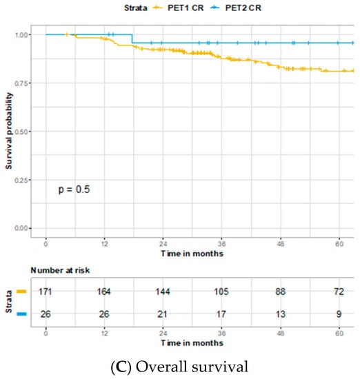 Interestingly, those who had a CR conversion on repeat imaging had improved FFP when compared to patients with CR on initial PET/CT, with trends observed towards better DSS as well. Given the large difference in sample number and the fact those with a CR conversion by definition avoided metastatic failure at approximately 6 months versus 3 months, it may be improper to conclude that a CR conversion is more favorable. Rather, these findings support the notion that a delayed CR is likely no different prognostically then an initial CR on PET/CT imaging.