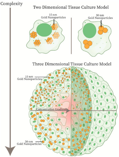 Two-Dimensional Tissue Culture Model vs. Three-Dimensional Tissue Culture Model. In a two-dimensional monolayer model, the gold nanoparticles have easy access to all the cells, allowing for optimization of uptake at a single cell level. However, the complexity of an in vivo environment is better approximated by the three-dimensional spheroid model. In a spheroid model, the uptake of smaller nanoparticles will penetrate deeper, allowing for targeting of difficult to reach cells. Further, a spheroid model allows for optimization in a tumor-like microenvironment, which can be largely affected by concurrent treatment with chemotherapy or radiotherapy.