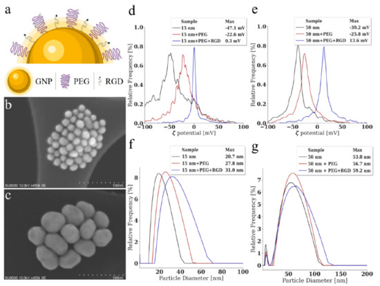 The size and surface characteristics of the GNP utilized is important to optimize, to improve treatment efficacy and reduce normal tissue toxicity in patients [55,56]. Thus, smaller nanoparticles (~16 nm) and larger nanoparticles (~50 nm) were synthesized, functionalized, and characterized. The GNPs were functionalized with polyethylene glycol (PEG) and a peptide containing integrin binding domain RGD, referred to as RGD, as seen in Figure 2a. The use of PEG is essential for future in-vivo success, as it improves biostability, biodistribution, and increases the circulation half-life [26]. The optimum capping density for PEG molecules onto GNPs was previously found to be 1 PEG molecule for nm2 of surface area, which was adhered to in these experiments [57]. While important, PEG has previously been shown to reduce the uptake of GNPs, and thus RGD, which can improve endocytosis and target tumors effectively, was used to improve uptake [34,58]. Scanning transmission electron microscopy was employed to confirm the size of the different GNPs as seen in Figure 2b,c. From a minimum of 100 measured GNPs of each sample, the smaller GNPs were found to have an average diameter of while the larger GNPs have an average diameter of ; these GNPs will be referred to as 15 nm and 50 nm GNPs in this paper. The -potential after conjugation with PEG and RGD was measured as seen in Figure 2d,e, along with the hydrodynamic diameter using dynamic light scattering (DLS) in Figure 2f,g.